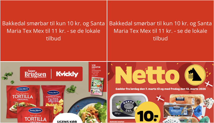 Netto tilbyder Bakkedal smørbar til en fantastisk pris på kun 10 kr. for 200 g. Bemærk, at der er en begrænsning på 6 stk. pr. kunde pr. dag. Tilbuddet gælder fra lørdag den 7. marts til fredag den 13. marts.