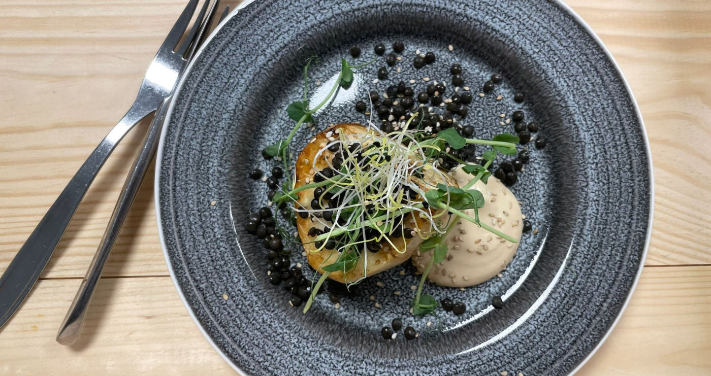 - Bagt selleri med Belugalinser, spirer og sesam dip